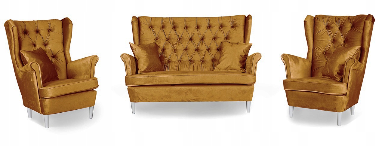 Zestaw którego dotyczy aukcja, wykonany został w tkaninie MONOLITH 48 – musztardowy złoty. Jeżeli jesteś wielbicielem stylu glamour to ten zestaw jest właśnie dla Ciebie.